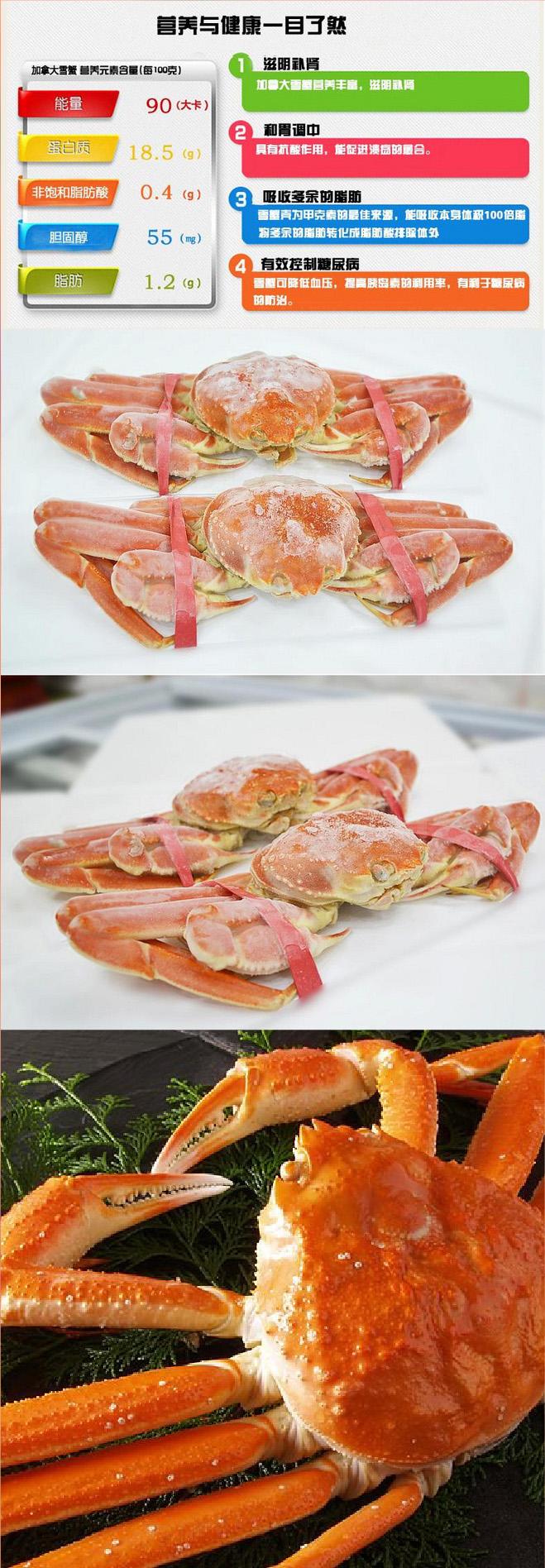 Snow crab is Alaska's largest crab resources, it can grow only in km under the deep sea pure wild, no pollution, succulent fresh sweet delicious, like the "Queen" of provide for oneself and live comfortably, so called queen crab.