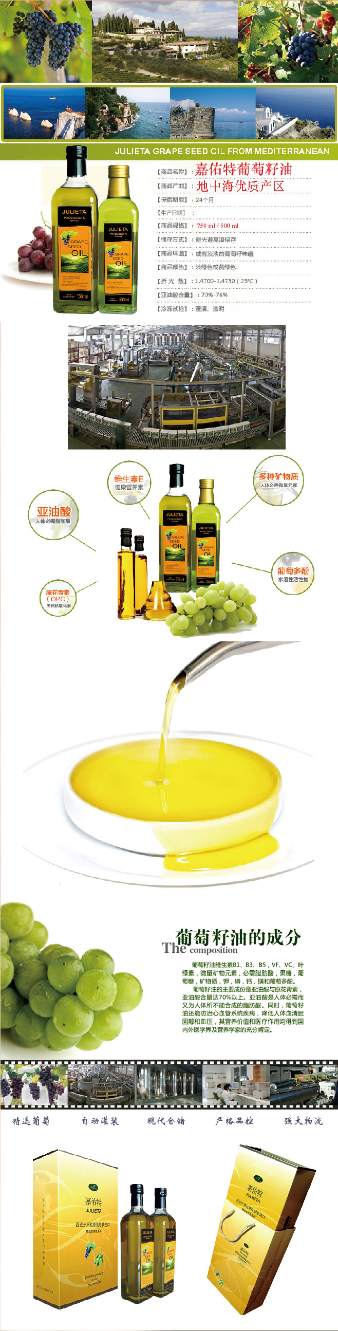 JULIET "Jia Youte" Grape seed oil is also produced a latest high edible oil, 100% imported, is made from fresh grape seed extract obtained after low content of edible oil products 100%, showing a beautiful and natural light yellow-green, is the edible oil market upstart. The EU has strict food quality control to ensure its outstanding quality.
